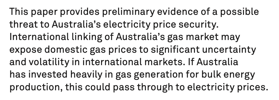 And well before then, back in 2012, an AECOM research paper specifically called out the risk to domestic energy pricing in linking gas to the global export markets, and recommended investment in a broad generation portfolio, including renewables, to counter this risk: