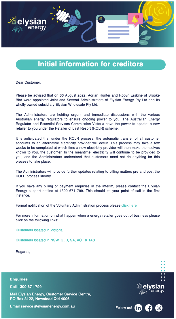 Elysian Energy was previously one of the most competitively priced retailers, but their customers yesterday, including many Bill Hero subscribers, received this email explaining that the company is now in receivership.